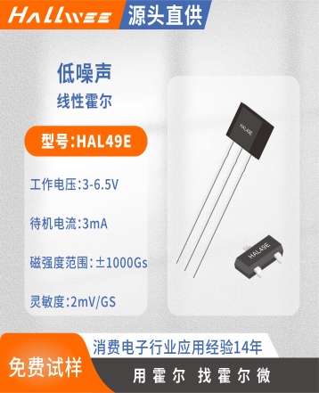 霍尔元件敏感区具有方向性与空间局限性。其有效感应区域通常位于芯片表面中心下方50~100 μm处,直径约0.5 mm。施加磁场时,磁力线必须垂直穿过该敏感面(即B⊥分量主导),倾斜角大于15°将引起灵敏度衰减超10%。禁止将霍尔元件置于强交变磁场中(如工频变压器漏磁>10 mT或变频器IGBT开关瞬态磁场>100 mT),此类磁场易在霍尔片内感应涡流,叠加热噪声导致零点漂移加剧,长期作用还可能引发材料磁滞老化。对于线性霍尔器件,工作磁场强度应严格限制在标称线性范围(如HAL49E为±900 Gs)内,超量程将导致输出饱和且恢复滞后;开关型器件(如HAL3144E)则需保证外加磁场强度超过BOP(动作点)且低于BRP(释放点)的迟滞区间,否则将出现振荡误触发。