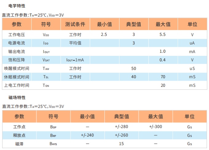 如果磁通密度⾼于“⼯作点”阈值或者低于“释放点”阈值,则开漏输出晶体管被驱动并锁存成与之相对应的状态。⽽在“休眠”周期中,输出晶体管被锁定在其先前的状态下。在电池供电应⽤中,这种设计对于延⻓⼯作寿命提供了最好⽀持。