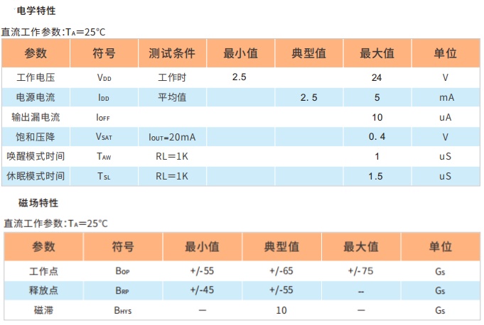 传感器可以在南极和北极⼯作。当磁场强度⼤于⼯作点Bop时,将输出低电平。然后保持输出,直到磁场强度低于释放点Brp,输出⾼电平。HAL245D提供TO92S插脚封装,贴⽚SOT23-3封装,两种封装都符合RoSH环保标准。