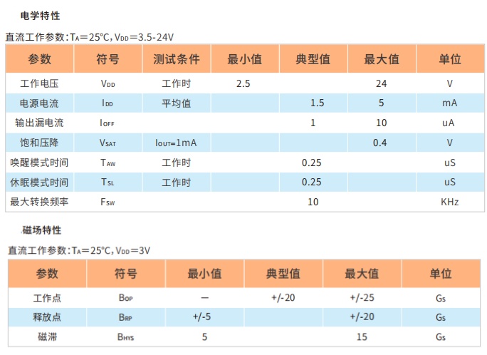 HAL245G的输出晶体管在⾯向封装标⽰⼀⾯存在⼀定强度南极或北极磁场时被锁定在低电平(BOP)状态,⽽在⽆磁场时锁定在⾼电平(BRP)状态。