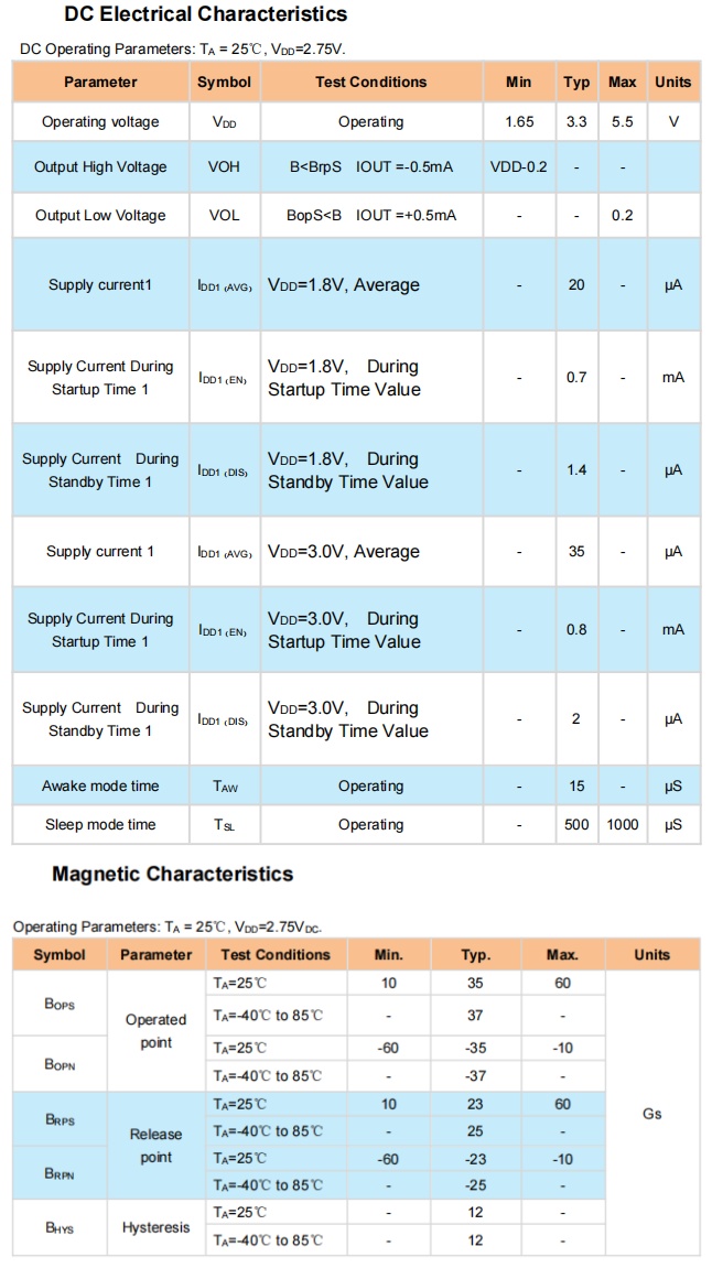 HAL204采用混合信号CMOS工艺制造,内置芯片级霍尔电压发生器、支持1.65-5.5V供电的稳压器、低功耗休眠唤醒逻辑、温度补偿电路、小信号放大器、带动态偏移消除系统的霍尔传感器、施密特触发器及开漏输出端。当传感器南北磁极均达到足够强度时,输出端将被激活;无磁场时输出端自动关闭。当磁通密度(B)超过工作点(Bop)时,输出端保持低电平状态;当B值低于释放点(Brp)时,输出端将被激活并维持该状态直至磁场强度下降。在3.3V电源供电下,正常工作时的总功耗通常为15μW。HAL204的工作温度范围为-40°C至85°C。