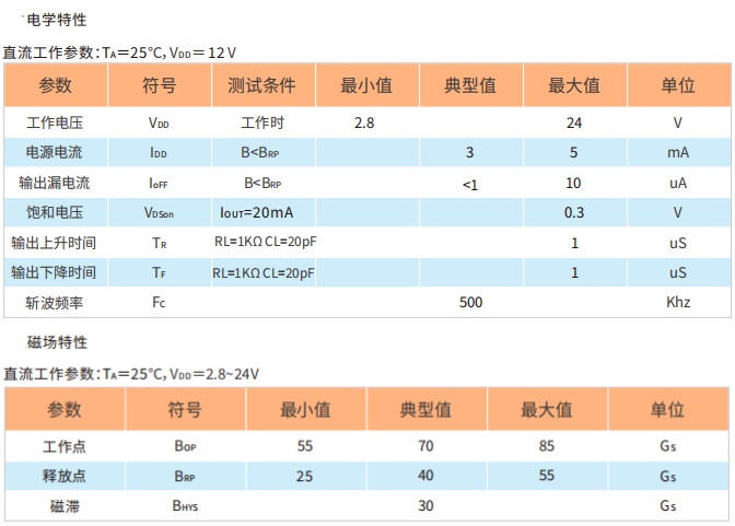 HAL1103是⼀款采⽤BCD⼯艺⽣产制作的单极型霍尔效应传感器,具备⾼灵敏度、⾼可靠性、⾼稳定性等优势。该产品内部集成了稳压电路、霍尔电压发⽣器、动态偏移补偿系统、施密特触发器、开漏输出等多个模块。⾼达47V的电源耐压与反向保护电路进⼀步提⾼了其可靠性。设计⽤于响应⼀个磁场:N极(SO)或S极(UA),当磁通密度(B)⼤于⼯作点(BOP)时,输出将打开(低),⽽磁通密度(B)⼩于释放点(BRP),输出关闭(⾼)。