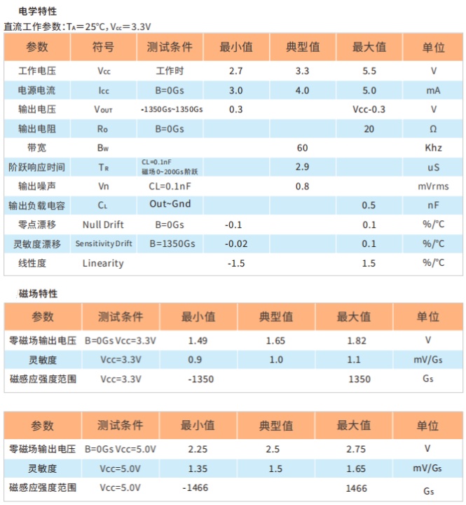 HAL4391 的零点(无磁场)输出电压默认为输⼊电源的 1/2,3.3V 下灵敏度典型值为 1mV/Gs,5.0V下灵敏度典型值为 1.5mV/Gs。