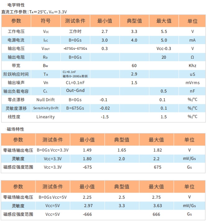 HAL4393 的零点(无磁场)输出电压默认为输⼊电源的 1/2,3.3V 下灵敏度典型值为 1mV/Gs,5.0V下灵敏度典型值为 1.5mV/Gs。