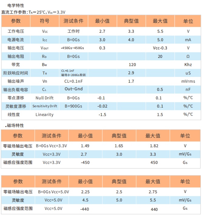 HAL4394 的零点(无磁场)输出电压默认为输⼊电源的 1/2,3.3V 下灵敏度典型值为 1mV/Gs,5.0V下灵敏度典型值为 1.5mV/Gs。