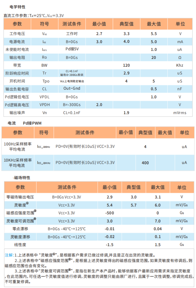 HAL4395在3.3V下零点输出电压(⽆磁场时)默认为3.0V,3.3V下灵敏度范围3-7mV/Gs内,可依据客⼾应⽤需求来指定灵敏度(详⻅:9.磁场特性表格中注解)。