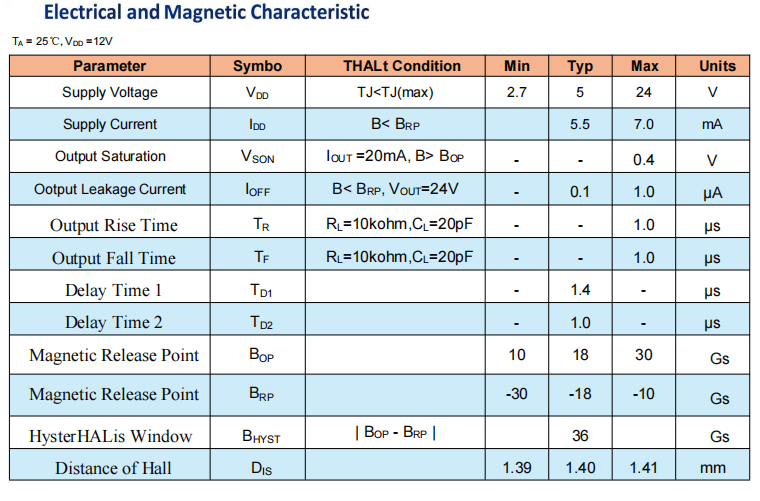 HAL1450内部包括两个相距1.40mm的霍尔传感元件、一个片上霍尔电压发生器、供电电压为2 .7至24V的电压调节器、温度补偿电路、小信号放大器、具有动态偏移抵消系统的霍尔传感器、施密特触发器和开漏极输出。信号处理的速度和信号都很容易。