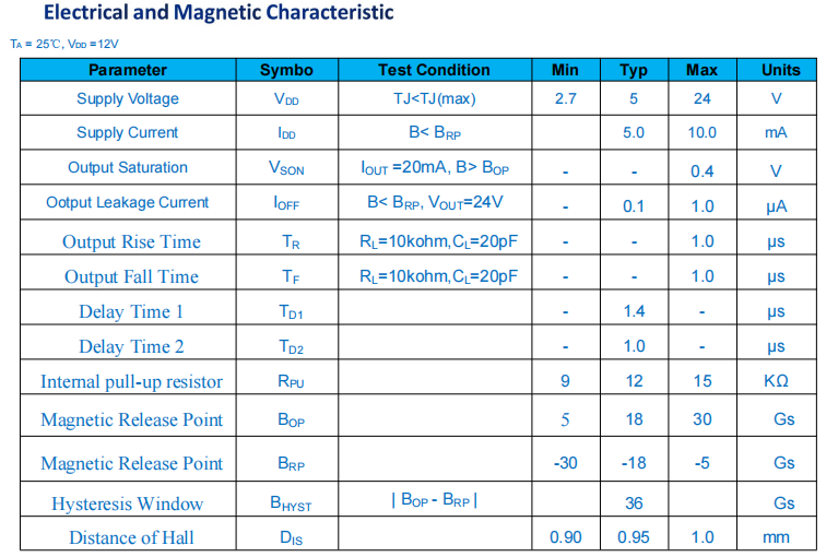 HAL1453内部包括两个相距0.95mm的霍尔传感元件,一个片上霍尔电压发生器、电源电压2.8至24V的电压调节器、温度补偿电路、小信号放大器、具有动态偏移抵消系统的霍尔传感器、施密特触发器和内部上拉电阻。信号处理速度和信号处理简单。